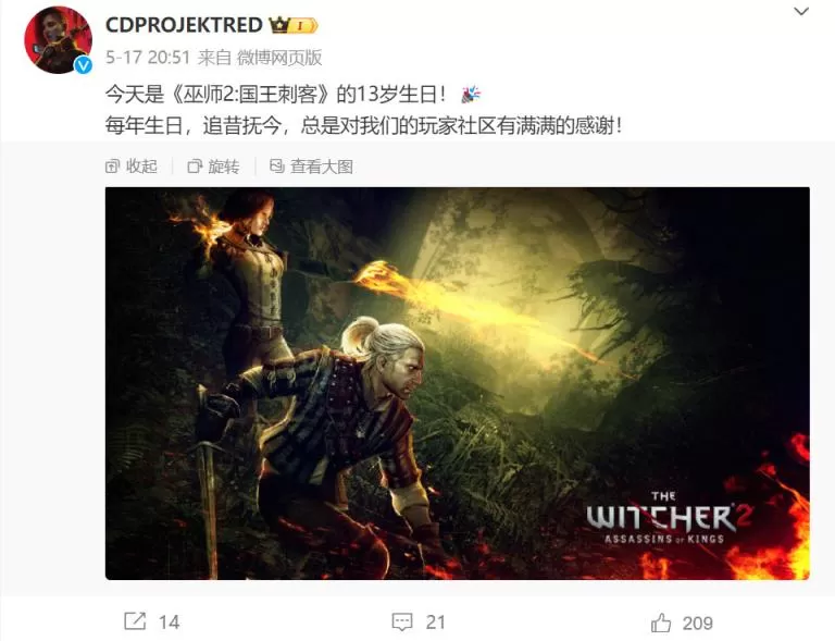 《巫师2》发售13周年 Steam特价促销仅售14.85元